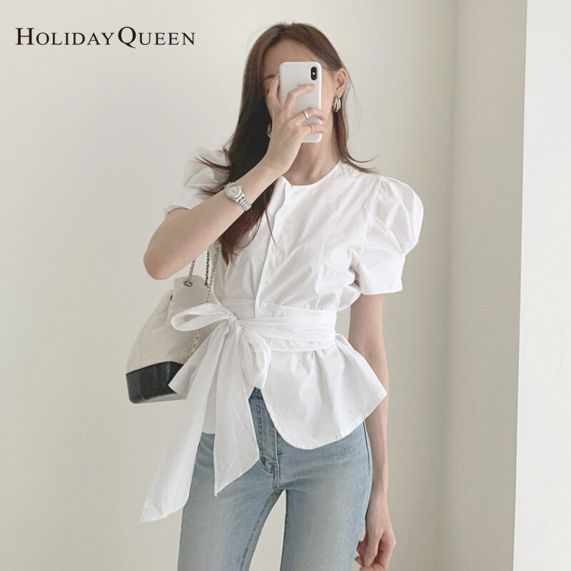 HolidayQueen Summer Puff Sleeve Tie Waist Waist Thin Chic Short Sleeve Shirt S M Free Shipping HQ0436